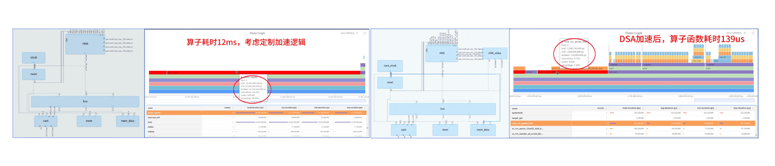 芯芒 Mosim 仿真平台提供了一系列创新高效的性能 Profiling 工具,可以帮助用户高效分析软硬件性能,快速定位系统性能瓶颈。比如 CPU 全量火焰图工具可以全量展现 CPU 程序从函数到指令级的执行耗时情况,无需在程序中侵入式加入打点代码。在本案例中,通过分析可发现 gemm 运算是计算热点,可通过扩展对应的向量计算指令实现性能加速。